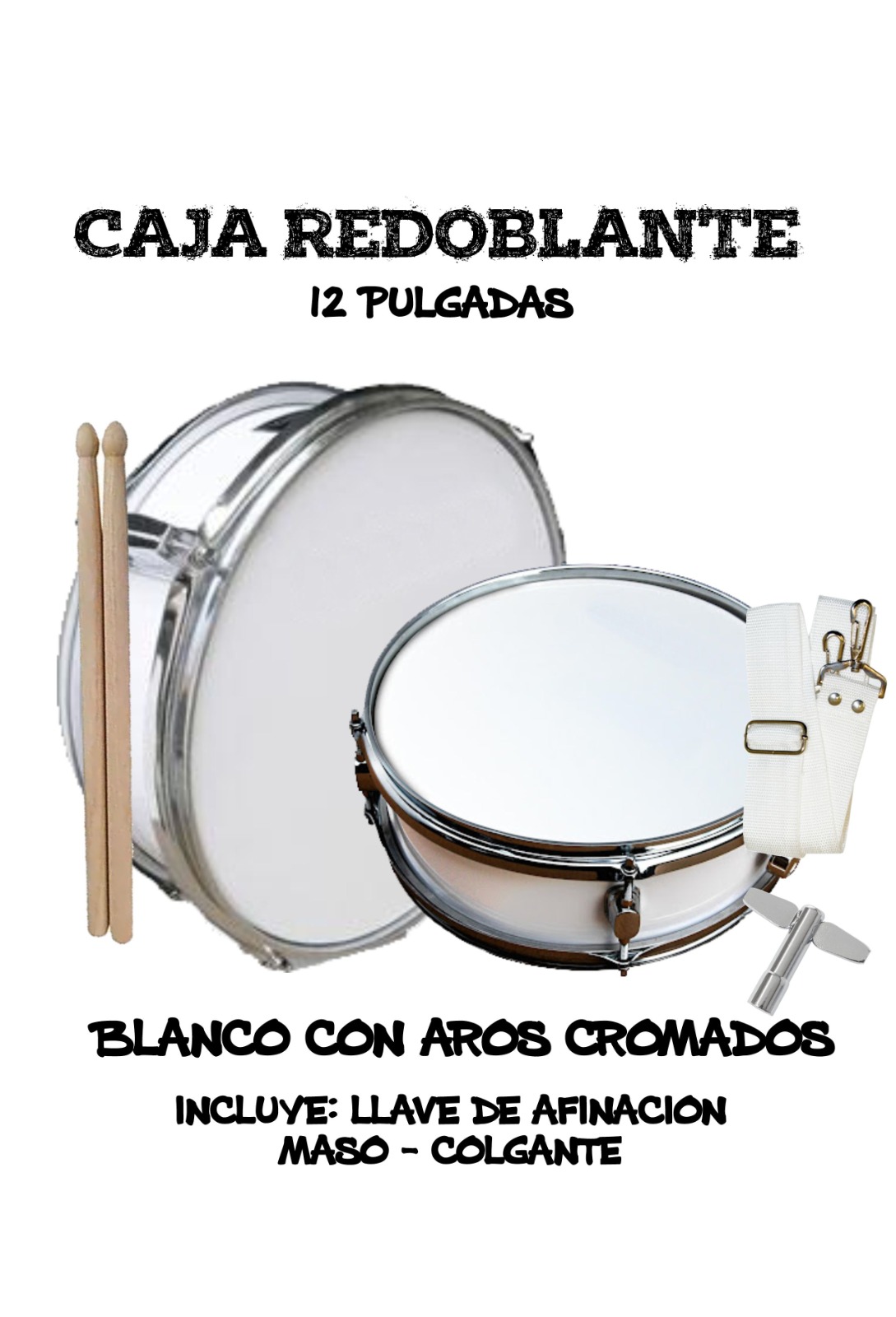 Ideal para principiantes e intermedios, con 6 tensores y terminación cromada. Incluye baquetas, correas de sujeción.